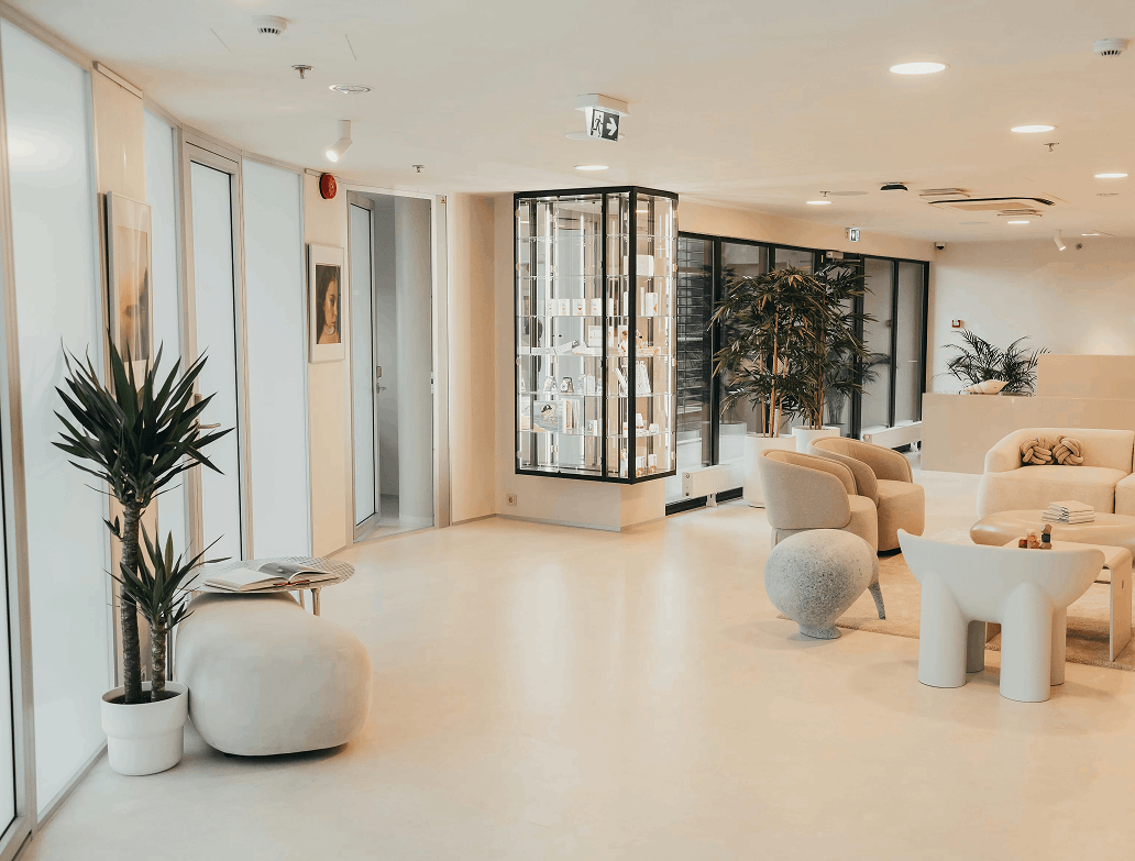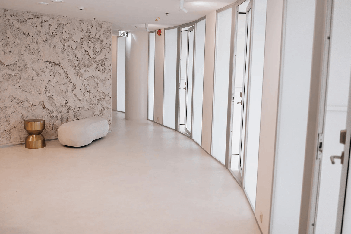 The interior of Meliva Maakri Dental Clinic, designed by Milli Maier Veske, is finished in UKU Lime Paints and Lime Marmorino — specified for healthcare environments requiring durable, mineral-based surface systems. Lime Marmorino adds a controlled matte surface and mineral depth, reinforcing the clinic’s restrained architectural expression.