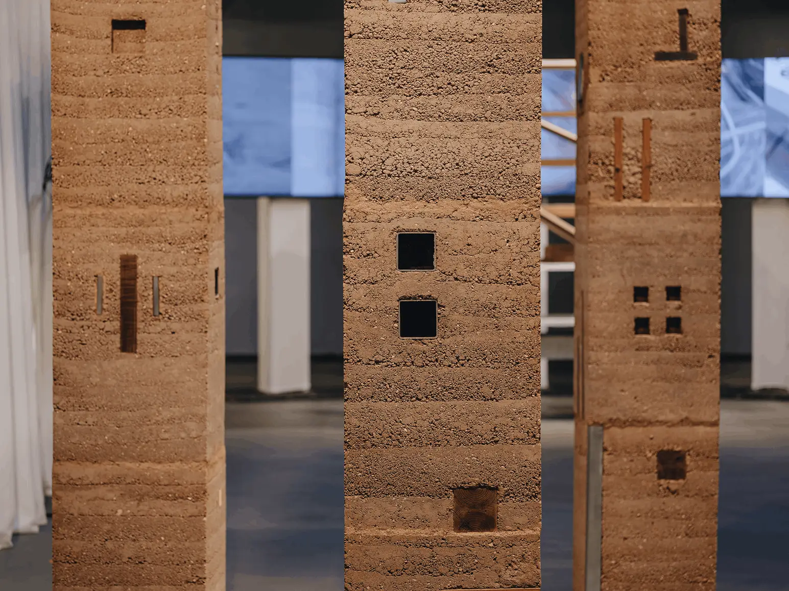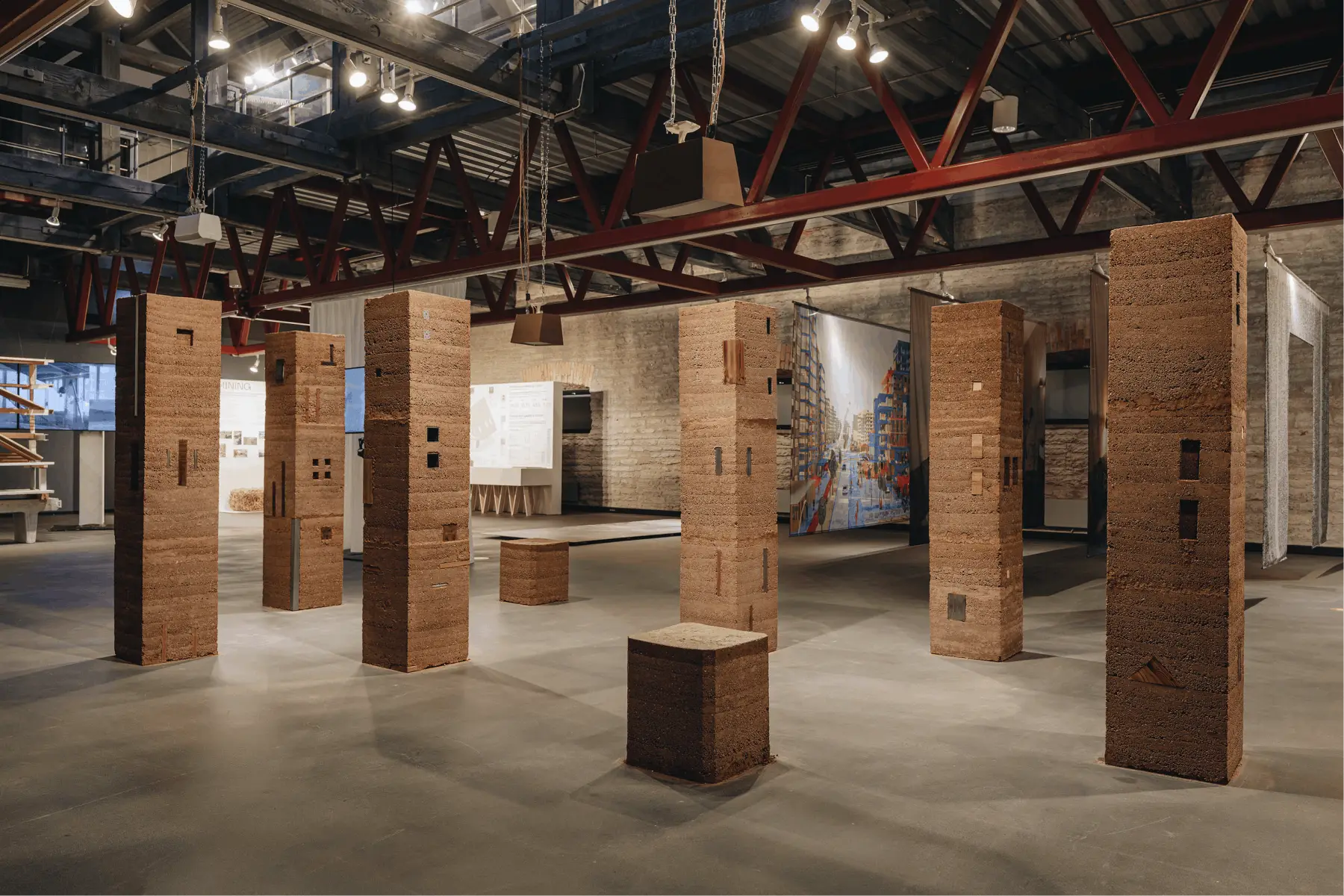 Presented at the Tallinn Architecture Biennale 2024, Ornamental Records from Tallinn explored structure and material through a series of rammed earth columns. Designed by Dechelette Architecture (France), the installation combined traditional earth construction with metal and wood fragments. The columns functioned both as structural forms and acoustic elements within the exhibition space.