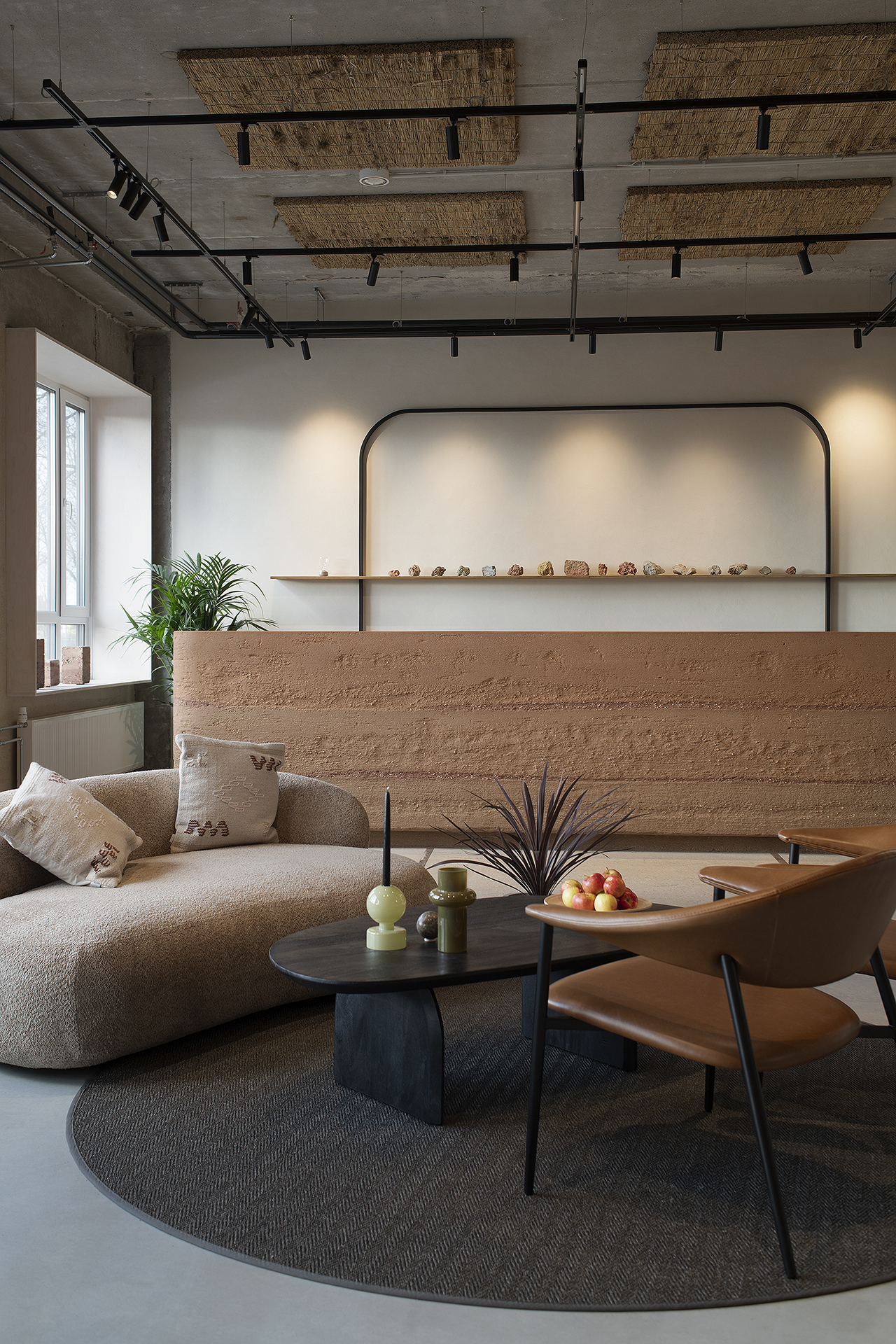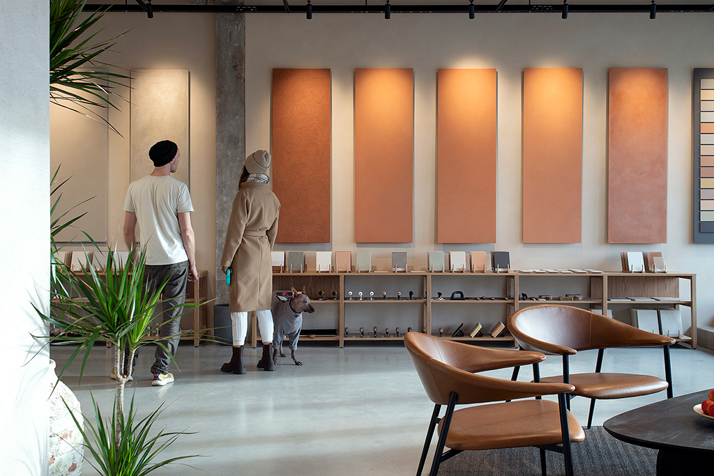 Here you will find a wide range of natural finishing materials: lime paints, clay paints, plasters, and custom solutions. The entire showroom is finished with UKU products, allowing you to experience their effect in real spaces. Large-scale samples in lime grey and South Estonian clay red help demonstrate how different surfaces influence the final result.