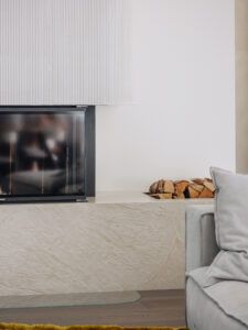 Loodusliku kivi ja vertikaalsete lubikrohvi triipude kooslus loob lihtsa, ent stiilse kamina atmosfääri.